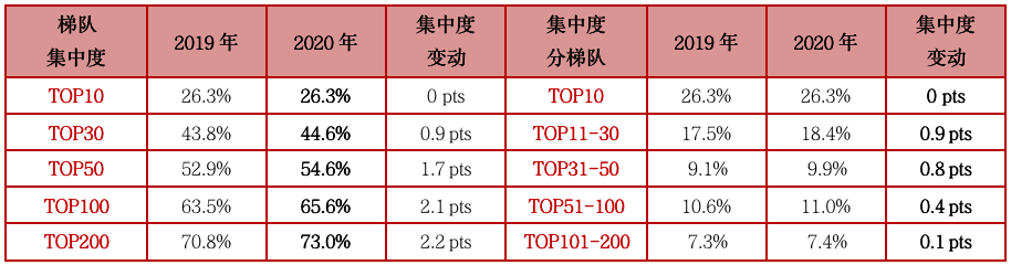 表:2020年TOP200各梯隊(duì)房企銷售操盤金額集中度