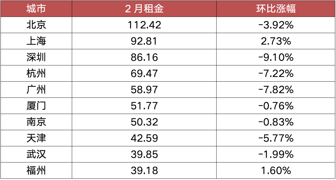 2月,上海平均租金以92.81元/平方米/月位列全國第二位。而同為長三角城市的杭州租金水平也達(dá)到69.47元/平方米/月,超過一線城市廣州,排在了全國第四位。租金水平位于全國第三位的深圳,則在2月創(chuàng)下環(huán)比領(lǐng)跌全國,環(huán)比降幅達(dá)到9.1%。