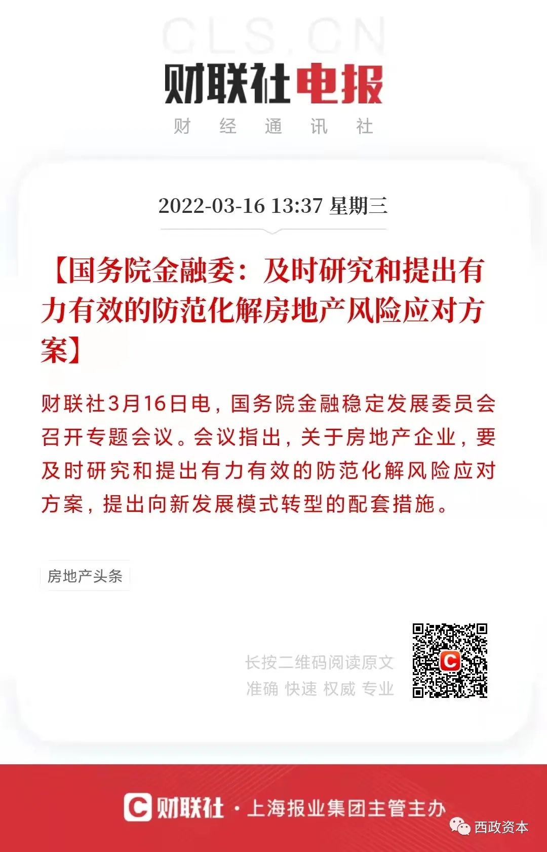 一、國務院金融委:及時研究和提出有力有效的防范化解房地產風險應對方案