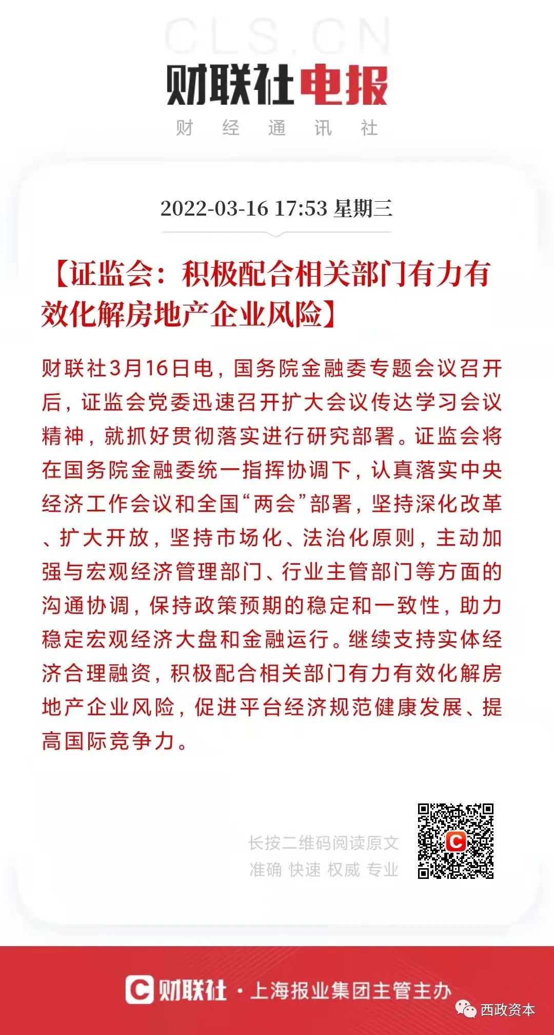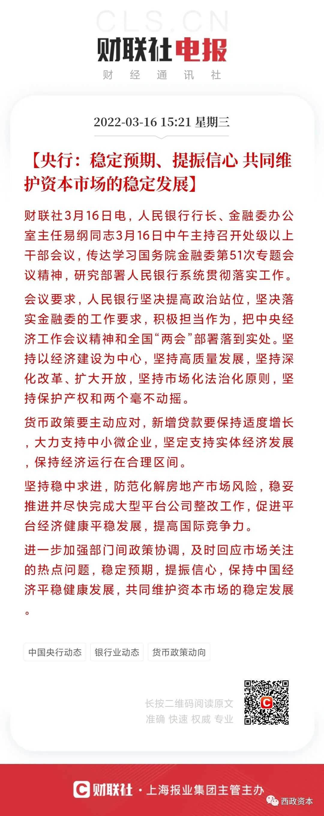 2022年3月16日上午,國務院金融穩(wěn)定發(fā)展委員會召開專題會議,研究當前經濟形勢和資本市場問題。會議提出,“在當前的復雜形勢下,最關鍵的是堅持發(fā)展是黨執(zhí)政興國的第一要務,堅持以經濟建設為中心”;會議強調,“有關部門要切實承擔起自身職責,積極出臺對市場有利的政策,慎重出臺收縮性政策”。隨后,央行、銀保監(jiān)會、證監(jiān)會、財政部、外管局等均積極表態(tài)維穩(wěn),并及時研究和提出有利有效的防范化解房地產風險應對方案。