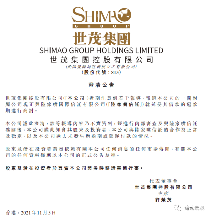 2021年11月4日,網傳“世茂旗下公司正與陸家嘴信托就延長其借款的還款期進行商討”,引發世茂系股債紛紛大跌。隨后2021年11月5日,陸家嘴信托與世茂相繼發布澄清公告,并啟動對股票與債券的回購舉措。不過,這一傳言還是引起了市場對世茂基本面的關注,表明其流動性情況有一定程度的緊張。