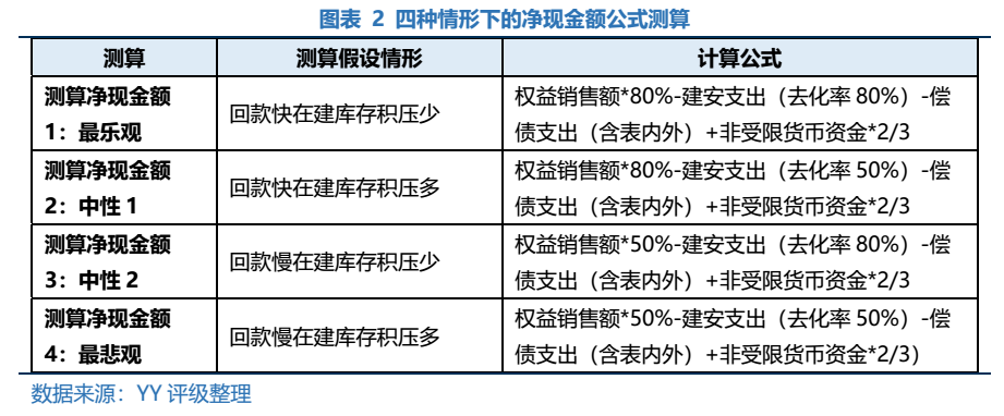 我們的假設最核心的是假設企業不再拿地和到期債務清償為主(含可動用貨幣資金),在此基礎上大致基于以下次生假設:分2個維度,各區分2種情形:周轉去化率樂觀及悲觀分別為80%、50%;銷售回款率樂觀時80%,悲觀時僅為50%,總計從樂觀到悲觀延伸4種組合。