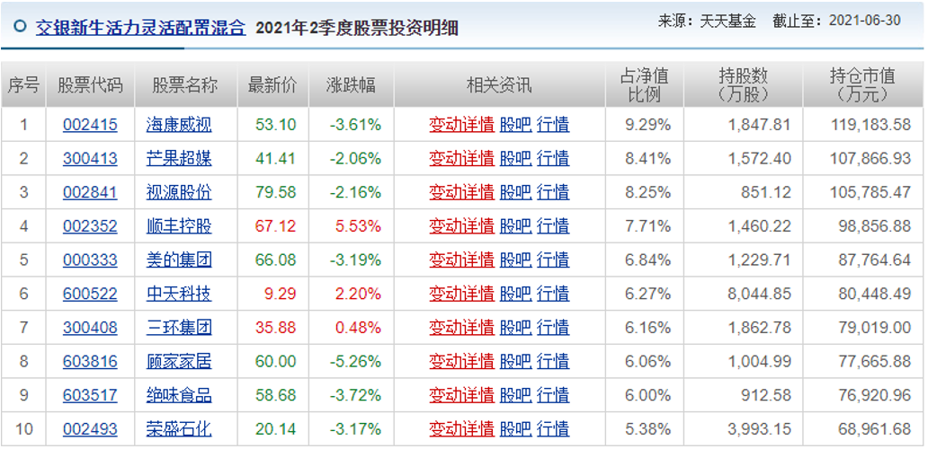 從資產配置上看,“交銀新生活力”屬于典型的集中持股,90%的股票倉位,前十大重倉股就占了70%。簡單來說,就是業績走勢基本上以這十只股票的表現為基調了。