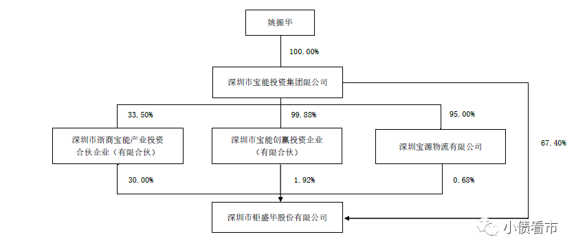 從股權(quán)結(jié)構(gòu)看,寶能集團(tuán)持有鉅盛華67.4%股份為其控股股東,姚振華持有寶能集團(tuán)100%股份,為公司實(shí)際控制人。
