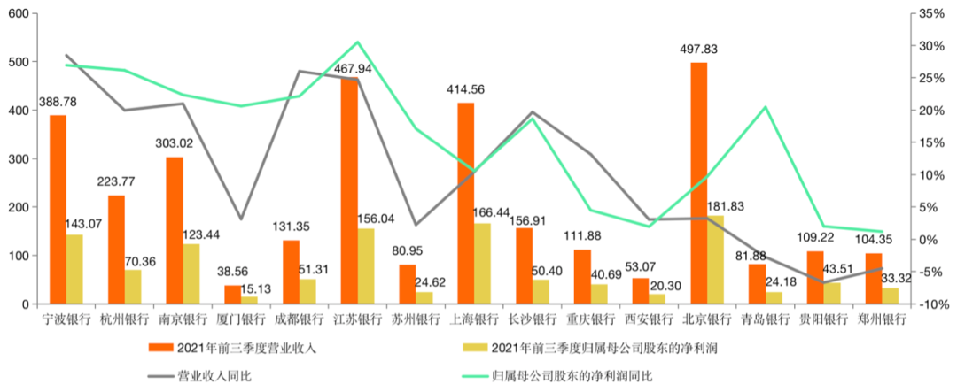 一、城商行業(yè)績PK:寧波銀行營業(yè)收入同比最高,保持穩(wěn)健發(fā)展縱觀15家A股上市城商行,2021年前三季度的整體業(yè)績表現(xiàn)為正增長,呈現(xiàn)出逐步擺脫疫情影響的良好經(jīng)營態(tài)勢。零壹智庫選取營業(yè)收入與歸母公司凈利潤2項指標,綜合觀察城商行之間的業(yè)績表現(xiàn):