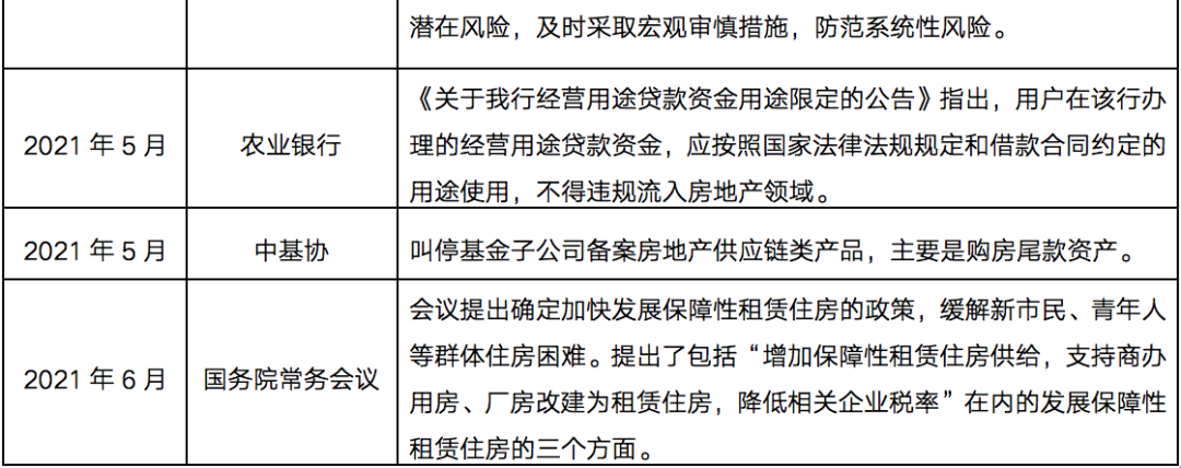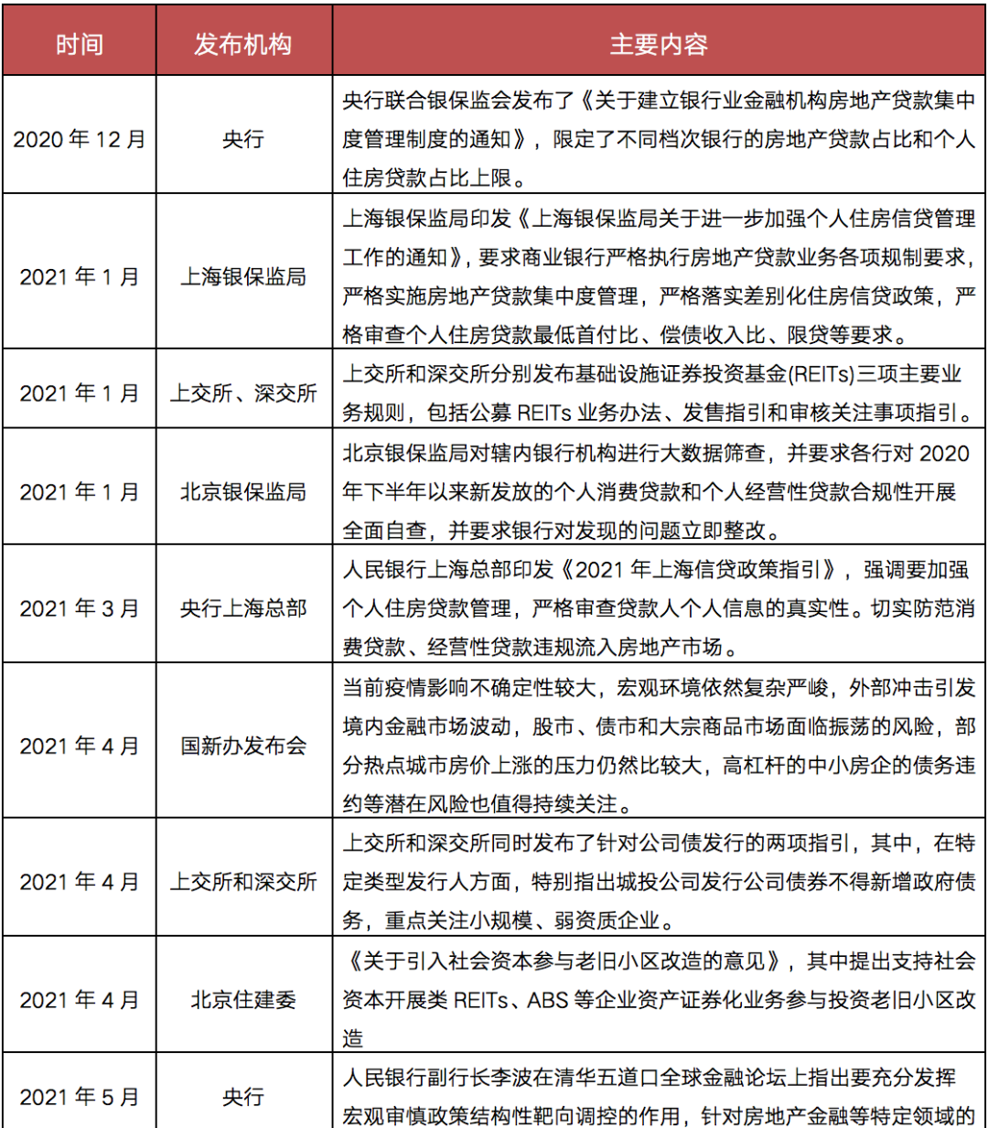 三條紅線和貸款集中度政策出臺后,房企融資供需兩端持續收緊。2021年上半年房地產融資合規審查方面的政策監管也在持續加強,上海、北京、深圳等地嚴查經營貸款違規入市,此外,為防范房企債券違約金融風險,嚴控城投公司、弱資質企業發行公司債。
