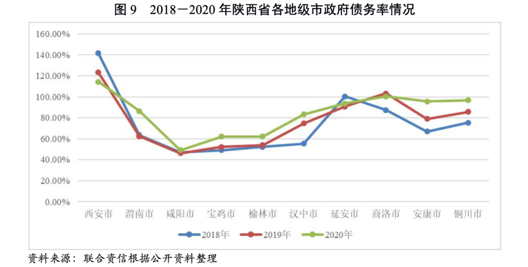 債務(wù)負(fù)擔(dān)方面,2018-2020年,除西安市外,其他地級(jí)市政府負(fù)債率均呈增長(zhǎng)態(tài)勢(shì)。2020年,商洛市政府負(fù)債率為省內(nèi)最高(38.92%),較上年增長(zhǎng)7.77個(gè)百分點(diǎn),商洛市政府負(fù)債率增長(zhǎng)最快(同比上升9.76個(gè)百分點(diǎn))。同期,榆林市、寶雞市和咸陽(yáng)市政府負(fù)債率均低于20%。