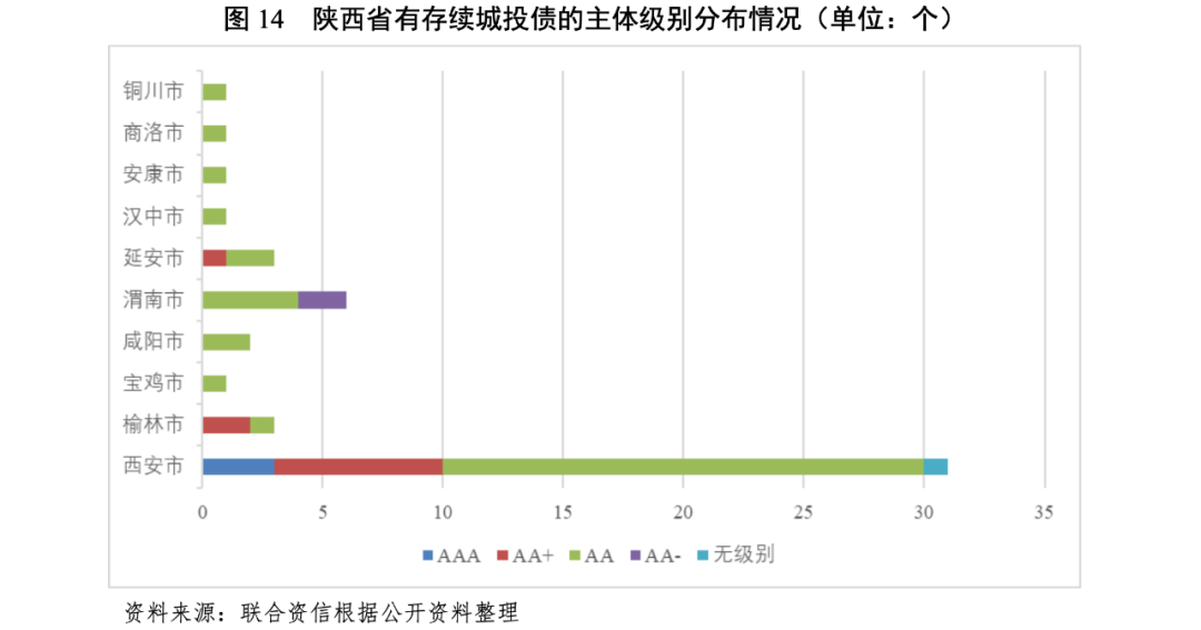 從主體信用級(jí)別區(qū)域分布看,陜西省城投企業(yè)中AAA主體共3家,全部在西安市;AA+級(jí)城投企業(yè)10家,其中西安市7家、榆林市2家和延安市1家;AA級(jí)城投企業(yè)34家,占陜西省有存續(xù)城投債券的主體數(shù)量的68%。高信用級(jí)別城投企業(yè)集中西安市,區(qū)域城投企業(yè)主體級(jí)別以AA為主。