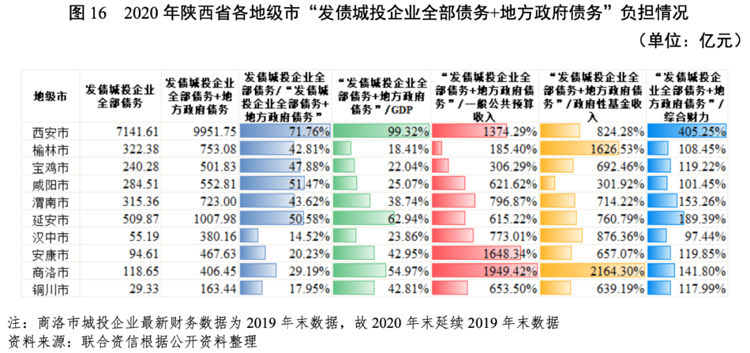 從各地級(jí)市政府綜合財(cái)力對(duì)“發(fā)債城投企業(yè)全部債務(wù)+地方政府債務(wù)”的保障支持程度來(lái)看,2020年地方綜合財(cái)力對(duì)“發(fā)債城投企業(yè)全部債務(wù)+地方政府債務(wù)”覆蓋程度最低的為西安市,其次為延安市和渭南市,覆蓋程度相對(duì)較高的為咸陽(yáng)市和漢中市。