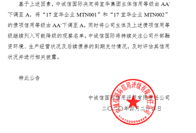 2019年12月20日,中誠(chéng)信國(guó)際下調(diào)宜華企業(yè)(集團(tuán))有限公司主體評(píng)級(jí)至AA-,旗下“17宜華企業(yè)MTN001”和“17宜華企業(yè)MTN002”的債項(xiàng)信用等級(jí)至AA-。