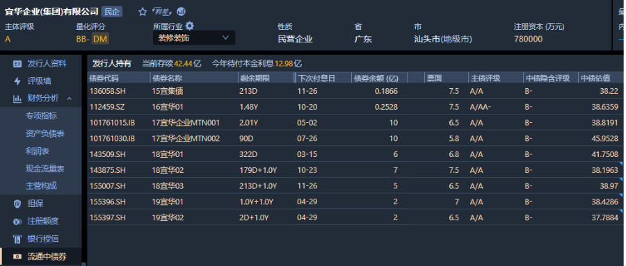 宜華企業(yè)(集團(tuán))當(dāng)前流通中債券存續(xù)余額為42.44億元,今年待付本金利息合計(jì)12.98億元。