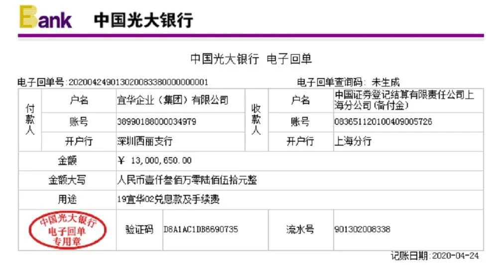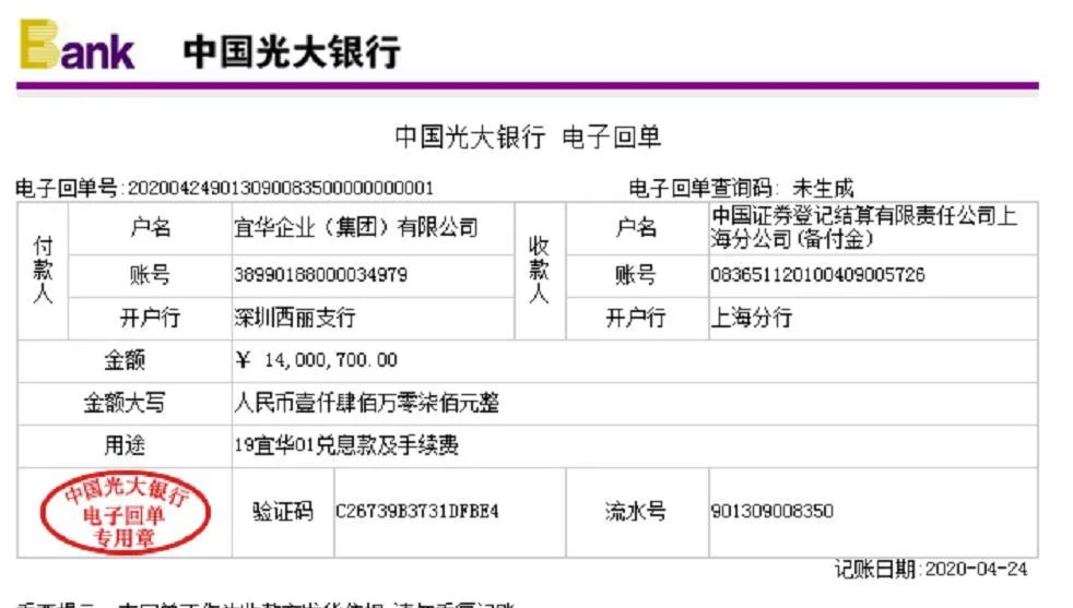 今日市場(chǎng)上流出宜華企業(yè)(集團(tuán))19宜華01、02兌息款的電子回單。