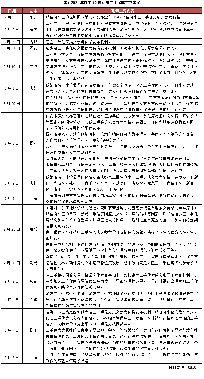 2021年以來,熱點城市紛紛加碼調(diào)控,并下沉到縣級市,地方調(diào)控趨于高頻化、精準化,根據(jù)市場過熱的實際情況,針對性采取調(diào)控政策措施,全面落實穩(wěn)地價、穩(wěn)房價、穩(wěn)預期。其中,二手房成交參考價成為本輪調(diào)控的新舉措。