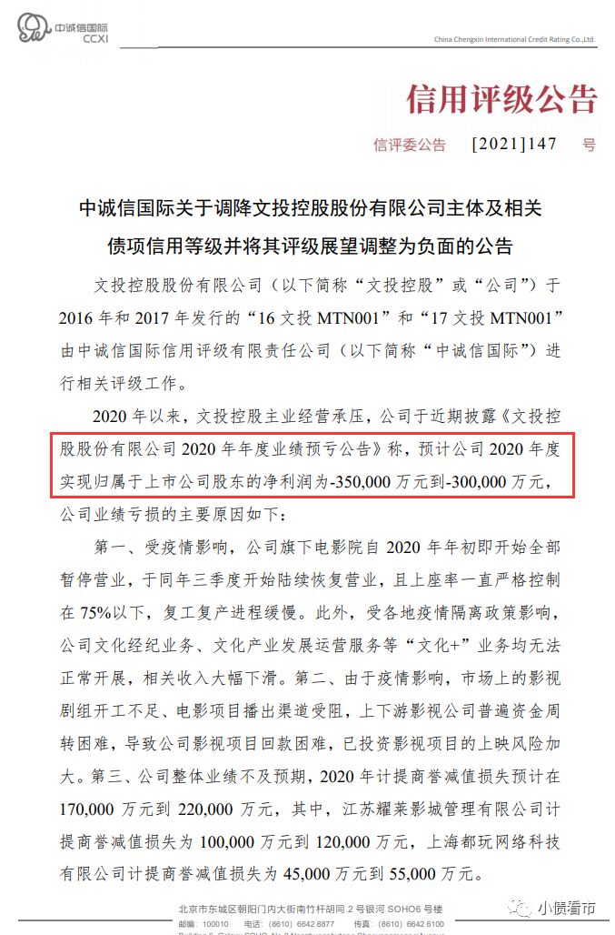 中誠信國際認(rèn)為,2020年文投控股業(yè)績大幅虧損且短期償債壓力加大,同時(shí)其影城經(jīng)營、影視投資制作及網(wǎng)絡(luò)游戲業(yè)務(wù)的回升仍存在不確定性, 公司2021年業(yè)績改善有待進(jìn)一步觀察。