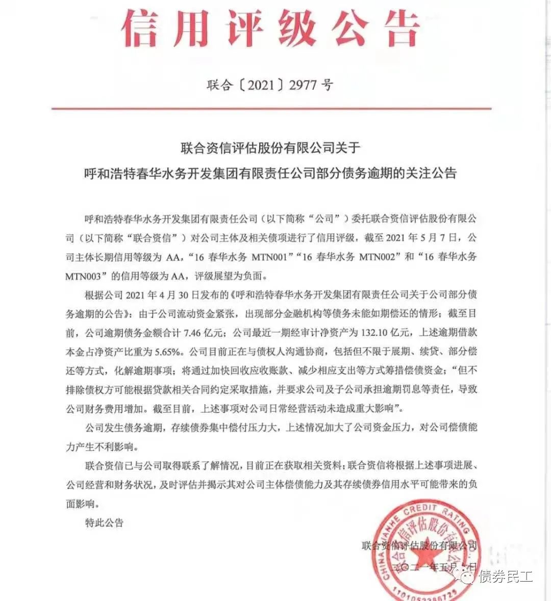 在此之前的2021年5月7日,聯(lián)合資信評估股份有限公司披露了《關(guān)于呼和浩特春華水務(wù)開發(fā)集團(tuán)有限責(zé)任公司部分債務(wù)逾期的關(guān)注公告》,將會(huì)持續(xù)跟蹤債務(wù)逾期事項(xiàng)對公司帶來的影響,但并未下調(diào)春華水務(wù)的主體信用評級。