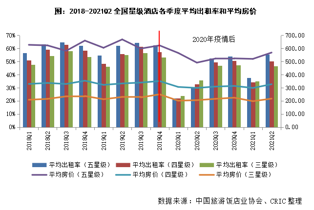 從中國旅游飯店業協會的數據來看,2018-2019年各季度全國五星級酒店平均出租率和平均房價分別為61%和622.5元/天,四星級酒店為57%和336.3元/天,三星級酒店為53%和226.5元/天。