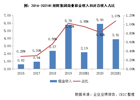旭輝商業近年來顯著加大了合作的力度,主要是因為其在2019年整合了旗下商業板塊之后,對于商業板塊的投入力度明顯加大,每年都會拿出集團投資額的10%用于商業拓展,同時也提出“未來旭輝希望收入50%來自住宅開發,30%來自租金收入,另外20%來自其他業務”,對商業地產領域的雄心可見一斑。但是當前的旭輝商業仍處于起步階段,規模相對較小。截至2021年中期,旭輝商業共有9個商業綜合體在營,在營建面63萬平米,與行業前列的萬達、華潤、龍湖等企業仍有著不小的差距。相應的,旭輝商業帶來的租金收入也相對較少,2021上半年旭輝商業板塊的租金收入約為3.91億元,同比增加78.5%,僅占集團上半年總收入的1.07%。