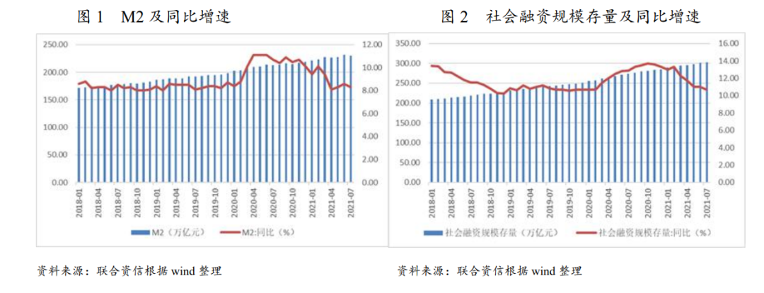 2021年以來,隨著疫情逐步得到控制以及經(jīng)濟(jì)逐漸恢復(fù),央行的貨幣政策由“穩(wěn)增長”向“防風(fēng)險和調(diào)結(jié)構(gòu)并重”轉(zhuǎn)變,2021年上半年,M2和社會融資規(guī)模增速在經(jīng)歷了一季度的高點后逐步回落至疫情前水平。
