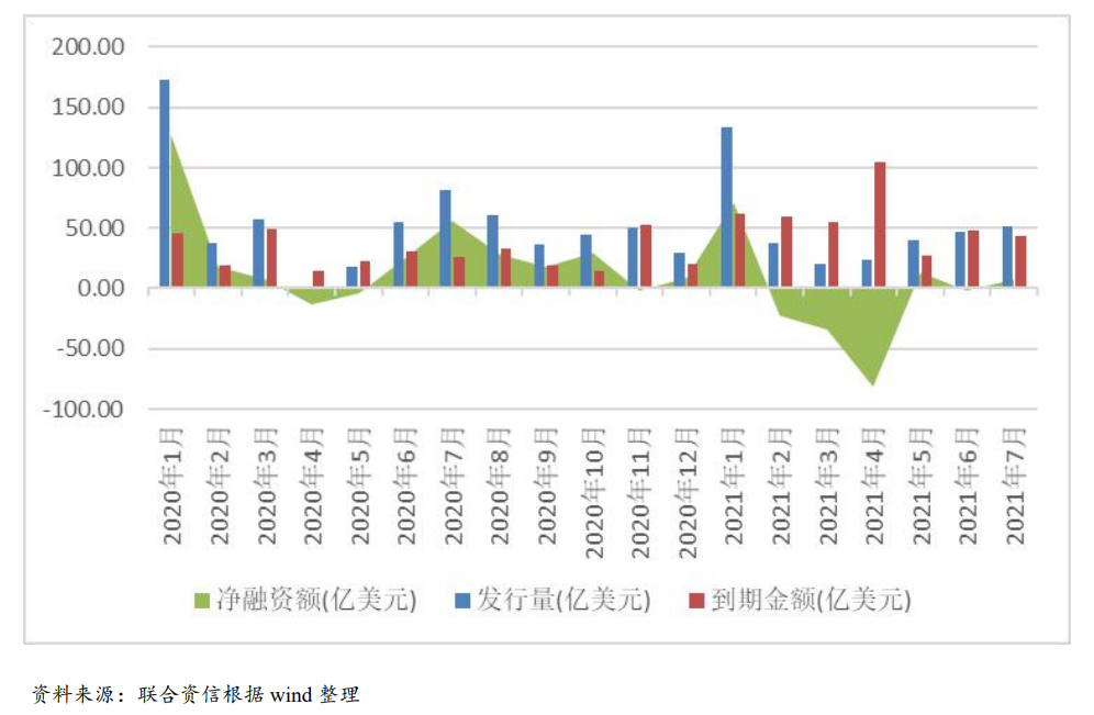 美元債融資方面,發(fā)行量同比大幅減少,凈融資規(guī)模為負(fù)。2021年1-7月,境內(nèi)房地產(chǎn)企業(yè)美元債發(fā)行總量353.08億美元,同比減少16.69%,受境內(nèi)房企違約事件頻發(fā)影響,加之恒大風(fēng)險持續(xù)發(fā)酵,投資者風(fēng)險偏好降低,自2月以來,地產(chǎn)美元債發(fā)行量保持低位;凈融資規(guī)模方面,2021年1-7月,境內(nèi)房地產(chǎn)企業(yè)美元債到期401.13億美元,凈融資轉(zhuǎn)為凈流出;分月份看,為應(yīng)對年內(nèi)到期的美元債兌付,1月境內(nèi)房地產(chǎn)企業(yè)美元債凈融資規(guī)模較大,2-4月凈融資規(guī)模持續(xù)凈流出且規(guī)模較大,5月以來凈融資規(guī)模保持低位。