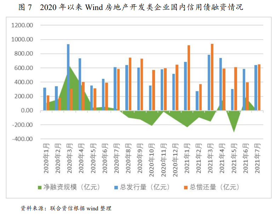在房地產(chǎn)融資監(jiān)管持續(xù)高壓及地產(chǎn)違約事件頻發(fā)下,投資者風(fēng)險偏好下行,發(fā)行規(guī)模增速明顯放緩,凈融資規(guī)模走弱。具體來看,2021年1-7月房地產(chǎn)開發(fā)類企業(yè)信用債發(fā)行總量4005.56億元,同比增長7.63%,增速明顯放緩;考慮到償還規(guī)模4492.93億元,實際融資規(guī)模偏低;分月份看,3月和4月是集中融資月份,占上半年融資總額的45.27%,與往年走勢基本一致;受“三條紅線”影響,2021年1-7月,房企國內(nèi)債券凈融資規(guī)模為負(fù)。