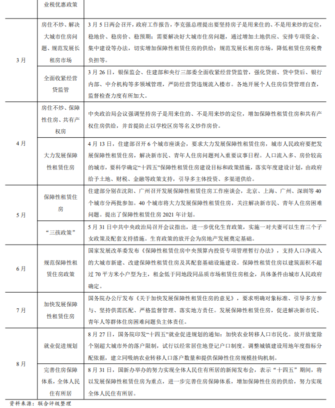 與此同時,在嚴(yán)格執(zhí)行“房住不炒、因城施策”的政策大環(huán)境下,新型城鎮(zhèn)化、住房保障體系建設(shè)作為重點持續(xù)被強(qiáng)調(diào)。3月5日,李克強(qiáng)總理作政府工作報告,提出通過增加土地供應(yīng)、安排專項資金、集中建設(shè)等辦法,切實增加保障性租賃住房和共有產(chǎn)權(quán)住房供給。此后,住建部4月召開6個城市座談會,要求各地增加土地、財稅、金融等政策支持,切實增加保障性租賃住房供給;7月,國務(wù)院發(fā)布《加快發(fā)展保障性租賃住房的意見》,要求從土地、審批流程、資金、稅費等多方面支持保障性租賃住房建設(shè)。8月31日,國新辦舉辦的努力實現(xiàn)全體人民住有所居的新聞發(fā)布會,表示“十四五”期間,將以發(fā)展保障性租賃住房為重點,進(jìn)一步完善住房保障體系,增加保障性住房的供給,努力實現(xiàn)全體人民住有所居。