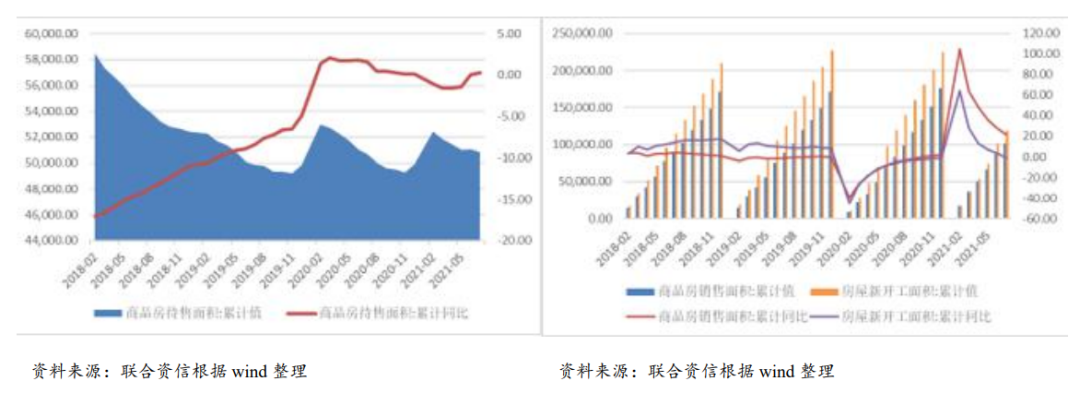 從狹義庫存(已竣工商品房待售面積)指標(biāo)來看,截至2021年7月底,商品房待售面積50864.00萬平方米,同比增長0.30%;整體看,已竣工商品房庫存年初達(dá)到高位,2-5月環(huán)比下行,6月以來庫存有所反彈。廣義庫存(累計新開工面積-累計銷售面積)方面,2021年1-7月,全國商品房新開工面積118948.27萬平方米,同比下降0.90%,累計銷售面積101648.18萬平方米,同比增長21.50%,廣義庫存有所增長。