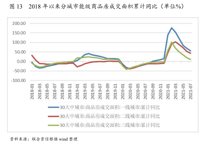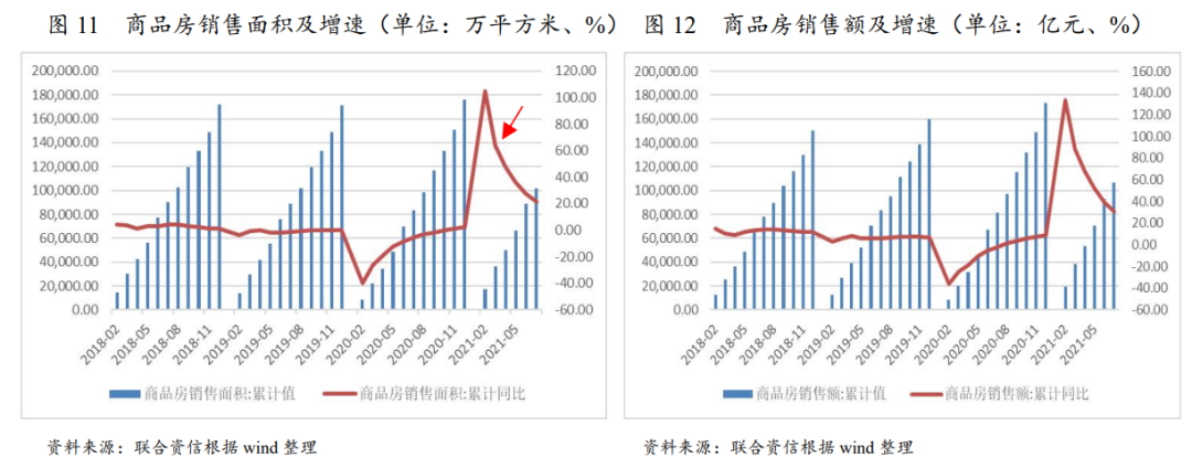 2021年以來,狹義庫存和廣義庫存均有所增長,由于通脹預(yù)期上行,銷售面積增速較快,但城市能級和區(qū)域分化明顯;長三角及大灣區(qū)市場較好,但隨著調(diào)控政策的升級,房地產(chǎn)市場有所降溫。考慮到目前庫存處于相對高位且房地產(chǎn)監(jiān)管政策趨嚴(yán),預(yù)計下半年需求或?qū)⑹艿綁褐疲又茔y行類金融機(jī)構(gòu)房地產(chǎn)貸款集中管理影響,房企銷售回款周期拉長,對弱資質(zhì)主體形成沖擊,房地產(chǎn)行業(yè)將短期承壓。