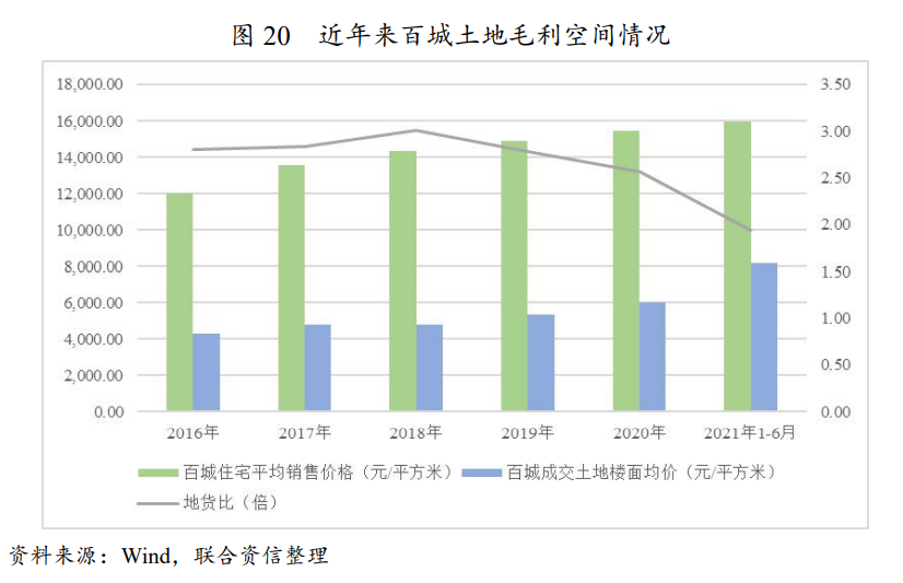 近年來,房企毛利率整體呈下降態(tài)勢,尤其隨著2017年前后高價地項目結(jié)轉(zhuǎn),2020年行業(yè)整體毛利率下降愈發(fā)明顯,僅從拿地均價及房價對比趨勢角度來看,房企遠(yuǎn)期真實盈利能力仍不容樂觀。