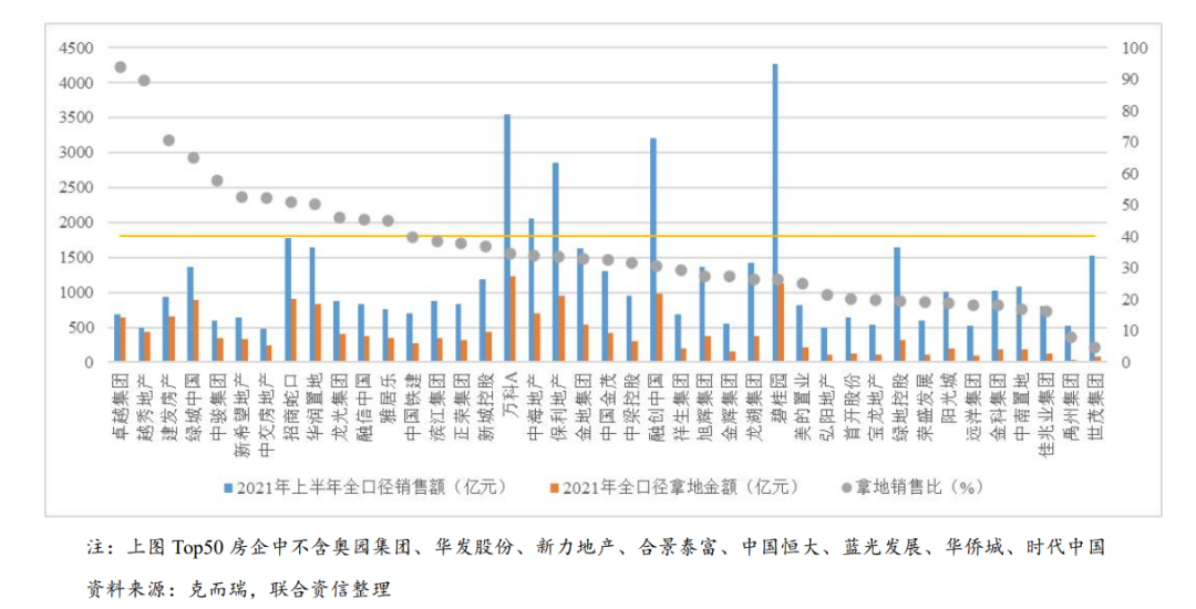 同時也需關(guān)注到,2021年7月,監(jiān)管重新強(qiáng)調(diào)被納入“三道紅線”試點房企新增土地金額不能超過年度銷售額40%,監(jiān)管范圍不僅限于公開市場拿地,還包括收并購方式獲地的支出。上述規(guī)則為去年8月出臺的“三道紅線”的配套要求之一,“雙集中”首批供地市場過于火熱,此則規(guī)定再度強(qiáng)調(diào)系側(cè)面要求房企在后續(xù)集中給供地時保持適度拿地節(jié)奏。在不排除“三道紅線”試點房企名單進(jìn)一步擴(kuò)容的前提下,該政策將限制處于擴(kuò)張期房企的擴(kuò)張規(guī)模和速度,彎道超車機(jī)會進(jìn)一步減少,將在一定程度上加劇分化,同時有助于提高房企開發(fā)及去化質(zhì)量。