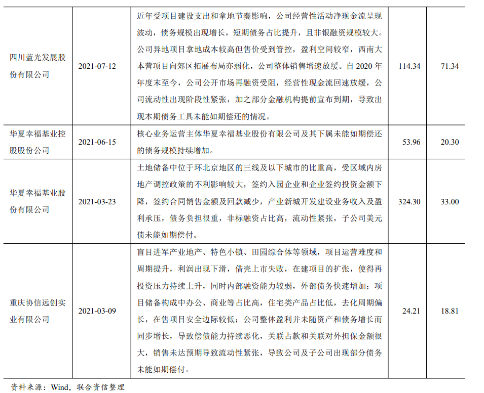2021年以來,房企債券市場新增實質(zhì)性違約企業(yè)包括四川藍(lán)光發(fā)展股份有限公司(以下簡稱“藍(lán)光發(fā)展”)、華夏幸福基業(yè)控股股份公司、華夏幸福基業(yè)股份有限公司和重慶協(xié)信遠(yuǎn)創(chuàng)實業(yè)有限公司(以下簡稱“協(xié)信遠(yuǎn)創(chuàng)”),均主要體現(xiàn)出了前期投資擴(kuò)張激進(jìn),項目銷售不及預(yù)期,項目回款明顯減少,非標(biāo)融資占比高,債務(wù)負(fù)擔(dān)重等特征,具體明細(xì)如下。