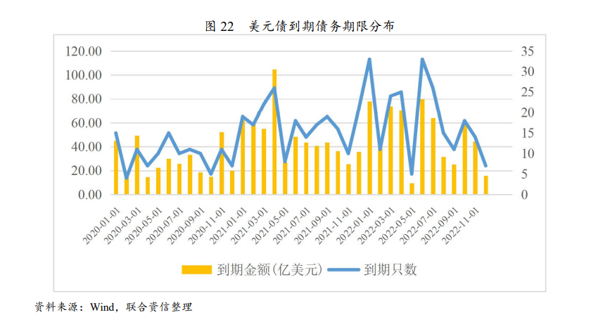 從房企到期債務(wù)期限分布來看,2021年1月及3月房企已經(jīng)歷一波償債高峰,進(jìn)入2021年下半年,9月隨著部分進(jìn)入回售期的債券數(shù)量的增加,房企到期債務(wù)量將呈現(xiàn)一波小高峰,隨后償債壓力將有所回落,但2022年房企到期債務(wù)壓力仍較大。美元債方面,2021年后半年到期債務(wù)數(shù)量及金額較上年有所下降,但進(jìn)入2022年尤其是2022年上半年,美元債到期數(shù)量及金額將顯著增加,未來房企仍面臨較大的兌付壓力,需持續(xù)關(guān)注房企流動性風(fēng)險及債務(wù)接續(xù)安排。