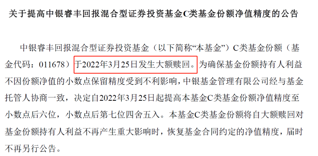 這一背景下,中銀基金旗下“固收+”產品中銀睿豐回報混合型證券投資基金3月26日公告稱該基金C類份額于3月25日發生大額贖回。為確?;鸱蓊~持有人利益不因份額凈值的小數點保留精度受到不利影響,決定自3月25日起提高C類基金份額凈值精度至小數點后六位,小數點后第七位四舍五入。