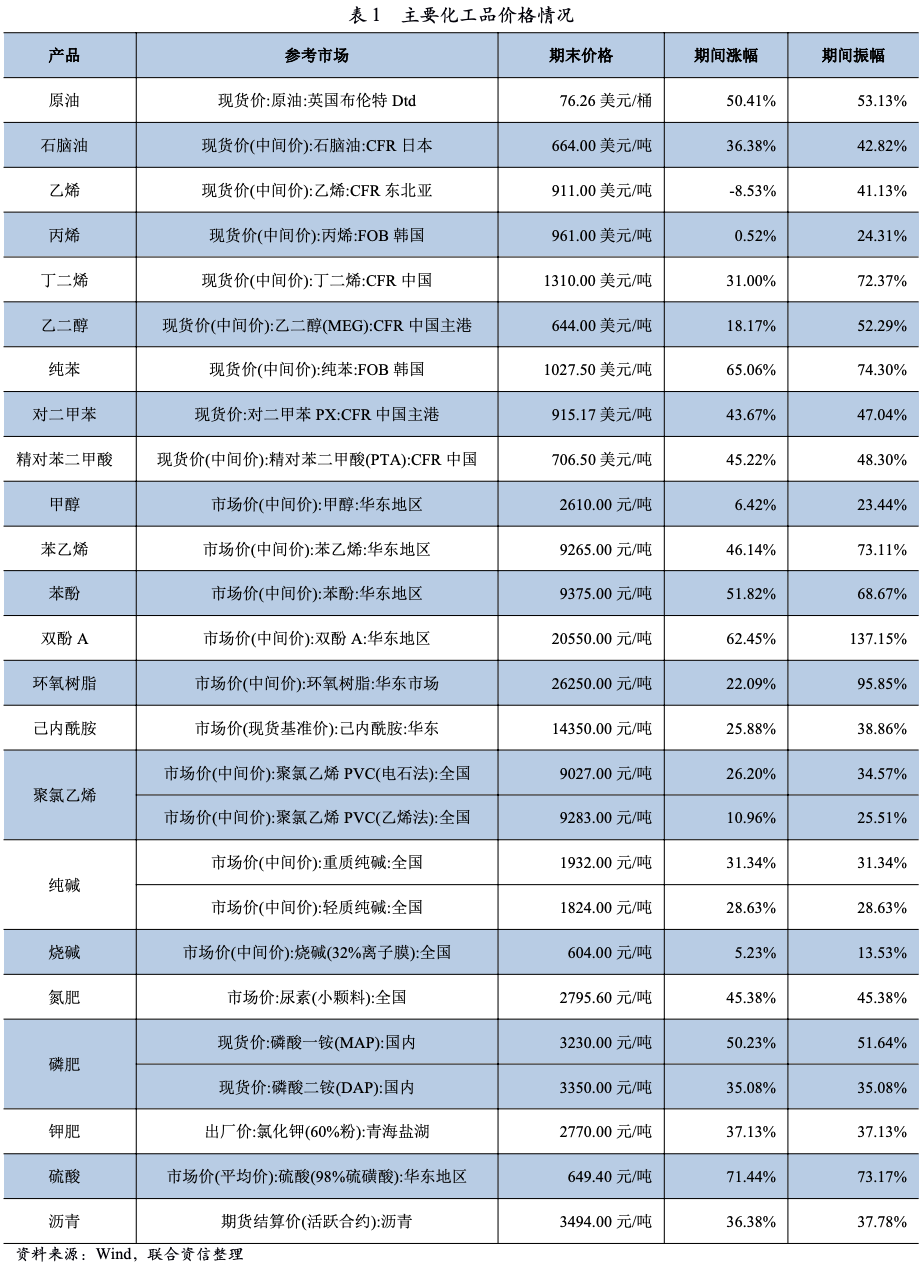 2021年上半年,受益于原油價格上漲及需求增加,主要化工品價格和產量同比增長,化工企業經營業績顯著改善。