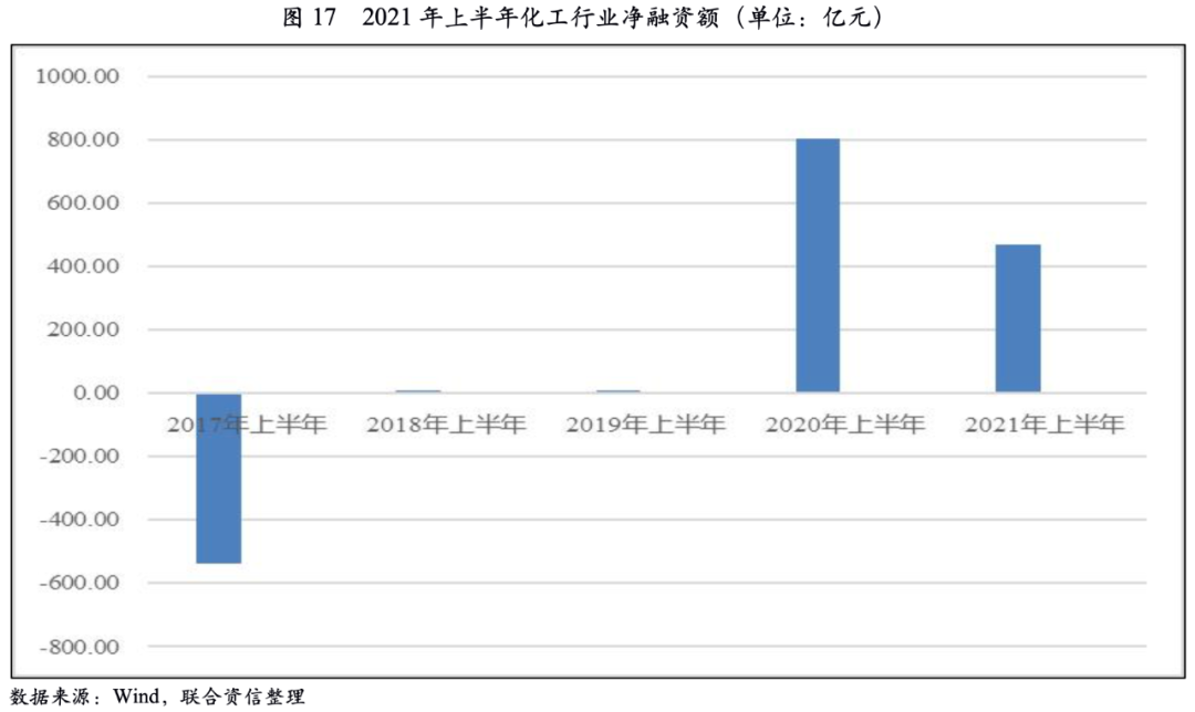 2021年上半年,化工行業凈融資額為470億元,同比下降41.47%,2021年上半年發行規模有所下降;但從近五年化工行業凈融資額來看,2020年以來化工行業形成新一輪融資高峰。