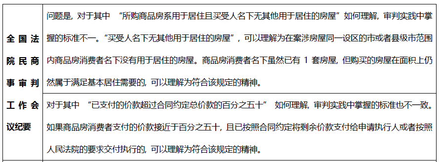 除了農民工兄弟之外, 花了真金白銀買房的老百姓也是金融機構債權回收時會面臨的問題。自《批復》起, 最高院即確認了“承包人就該商品房享有的工程價款優先受償權不得對抗已交付購買商品房的全部或者大部分款項后消費者”的原則, 即商品房消費者的物權期待權優于建設工程價款優先受償權, 更優于抵押權。之后, 該規定亦在《最高人民法院關于人民法院辦理執行異議和復議案件若干問題的規定》(以下簡稱“《執行異議規定》”)中得以體現。根據《擔保制度解釋理解與適用》, 正在制定中的執行異議之訴司法解釋也會吸納該等制度的精神和內容。對消費者特殊保護的政策將繼續一以貫之。