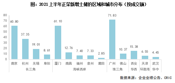 截至2021上半年底,正榮土地儲備2930萬平,權益建面比56%,總貨值約5100億元,保障未來2-3年的需求,去化周期適中。從各區域來看,62.1%的土地儲備集中于長三角和海西,兩大核心區域去化周期2-3年,與集團平均水平相匹配;而中西部、環渤海和珠三角土儲去化周期處4年以上,未來要加快以上區域項目的推盤和去化。