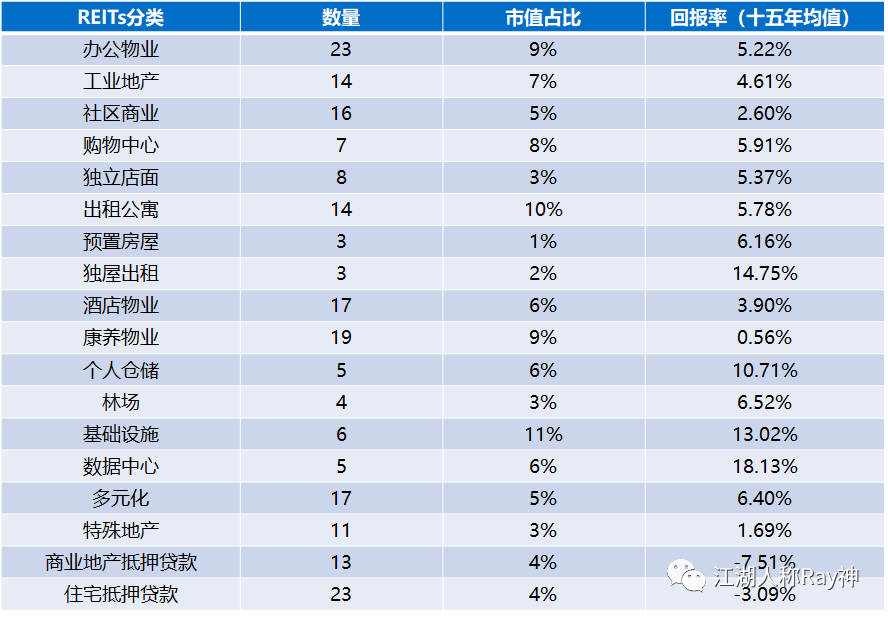 事實(shí)上,在全球的REITs領(lǐng)域,非商業(yè)地產(chǎn)類的資產(chǎn)占比并非少數(shù)。無論是類似于最近被談的最多的高速公路、橋梁等設(shè)施,還是數(shù)據(jù)中心、場館、物流園區(qū),甚至是超市、餐廳、學(xué)校、醫(yī)院等等,只要能夠產(chǎn)生經(jīng)營現(xiàn)金流回報(bào)的資產(chǎn)都可以做成REITs。