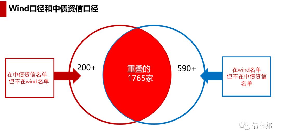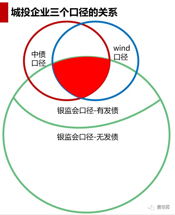 中債資信口徑和Wind口徑的城投債發(fā)行人的關(guān)系如下圖所示,兩者重疊率較高,而wind口徑所納入來(lái)的城投債發(fā)行人更多
