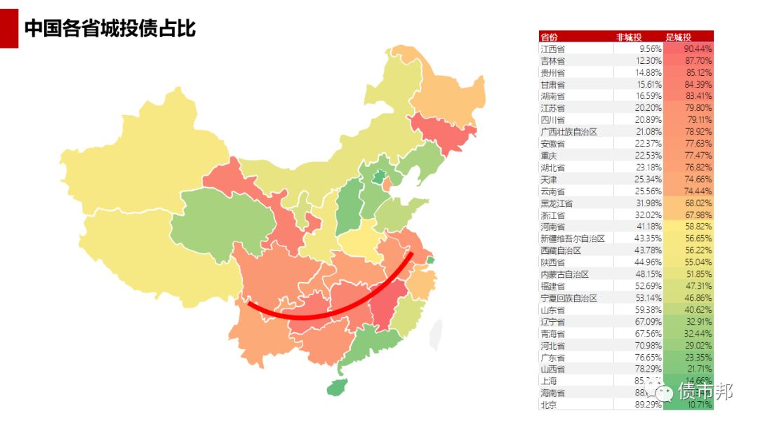 從各地區(qū)城投債占企業(yè)類(lèi)信用債占比來(lái)看,地域分布沒(méi)有體現(xiàn)傳統(tǒng)的東、中、西部的地域分布特點(diǎn),而是差不多沿著長(zhǎng)江流域的一個(gè)城投走廊(四川、云南、重慶、湖北、湖南、安徽、江蘇等)。