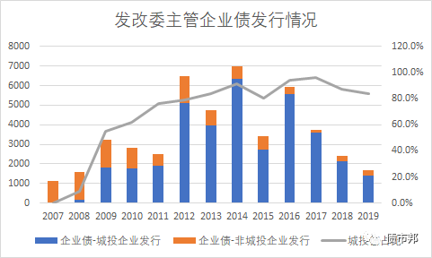 企業(yè)債與NAFMII的債務(wù)融資工具以及證監(jiān)體系公司債的一個(gè)最大不同,就是其募集資金用途必須包括項(xiàng)目建設(shè)(主要以基建為主),而這些基建項(xiàng)目的投資主體又是城投企業(yè),因此企業(yè)債是天然契合城投類(lèi)發(fā)行人的品種。近年來(lái)企業(yè)債中的城投發(fā)行金額占比長(zhǎng)期保持在80%以上,可以說(shuō)現(xiàn)在的企業(yè)債幾乎和城投債劃上了等號(hào)。