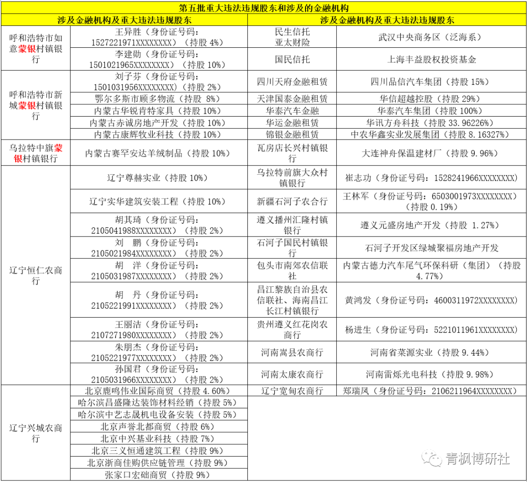 1、2022年5月31日,銀保監會披露43家重大違法違規股東,合計涉及25家金融機構。其中,這25家金融機構具體包括17家農村金融機構(6家農商行、9家村鎮銀行、包頭市南郊農信聯社和新疆石河子農合行),4家金融租賃(四川天府金租、天津國泰金租、華運金租、錦銀金租),2家信托(民生信托與國民信托),1家財險(亞太財險)以及1家汽車金融公司(華泰汽車金融)。