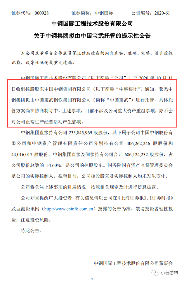 10月11日晚,中鋼國(guó)際(000928.SZ)和中鋼天源(002057.SZ)公告稱(chēng),公司于當(dāng)日收到控股股東中國(guó)中鋼集團(tuán)有限公司(以下簡(jiǎn)稱(chēng)“中鋼集團(tuán)”)通知,獲悉中鋼集團(tuán)擬由寶武集團(tuán)進(jìn)行托管,但目前具體托管方案尚在協(xié)商制訂中。