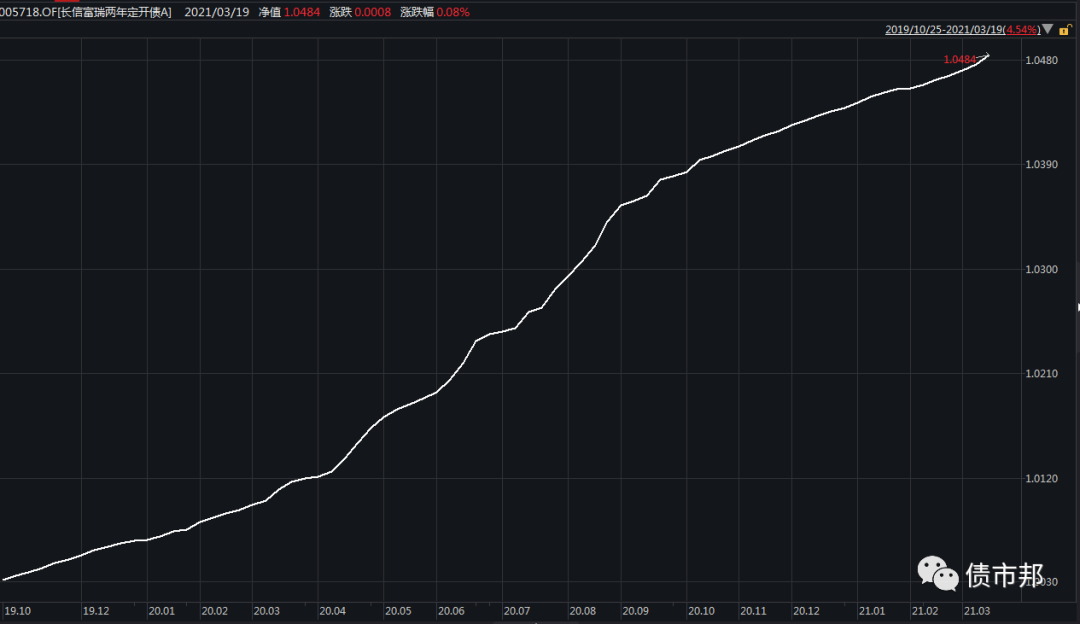 其次是剔除了采用攤余成本法估值的基金。很容易理解,采用攤余成本法基金凈值就是一條穩(wěn)定向上的曲線,除非持倉出現(xiàn)違約等問題,產品凈值完全無法體現(xiàn)持倉凈值的波動,自然就無法體現(xiàn)基金經理的投資水平了。即使在去年3月利率低點時拿了一把長債,攤余成本法基金凈值依然是穩(wěn)穩(wěn)的幸福,走勢如下圖所示: