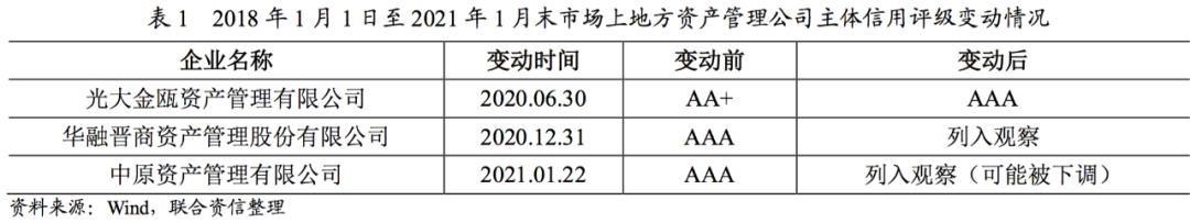 從行業信用級別調整情況來看,從2018年1月1日至2021年1月末,未有主體級別被下調的地方資產管理公司,有1家地方資產管理公司的主體級別從AA+被上調至AAA,系光大金甌資產管理有限公司,其主體評級被上調原因是該公司在集團戰略定位中有重要意義,且對資本金提升有明確的安排,預計未來公司資本實力將進一步增強。此外,華融晉商資產管理股份有限公司被列入評級觀察,主要系該公司所持有的資產涉及重大訴訟,未來涉訴資產對公司風險管理、流動性、盈利能力和短期償債壓力等多方面可能產生影響;中原資產管理有限公司被列入可能下調的觀察名單,原因是該公司外部融資環境有所惡化,且未來三個月債務規模較大,流動性趨于緊張,疊加企業自身盈利下滑,均對其信用狀況產生不利影響。