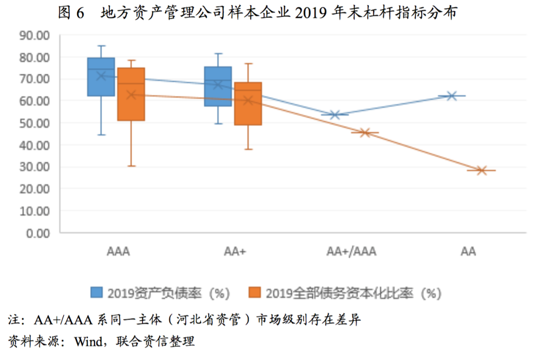從樣本企業資產規模來看,截至2019年末,主體AAA級別資產規模最大值1619.19億元、最小值106.74億元、平均值379.69億元;AA+級別企業中,資產規模最大值154.39億元,最小值57.08億元;存在級別差異的河北省資管,其資產規模為74.21億元;AA級別僅有一家企業,其資產規模為86.34億元,高于AA+級別最小值。