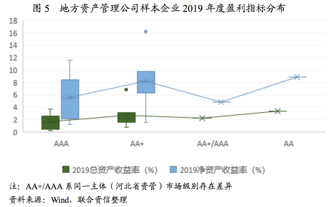 從盈利指標來看,AAA級別的地方資產管理公司因資產、資本金規模較大,盈利指標表現普遍不及AA+企業;存在級別差異企業的盈利指標可落于AAA級別區間;AA級別的唯一主體因其民營背景對資本運營效率要求等相對較高,其盈利表現明顯優于AAA級別企業。