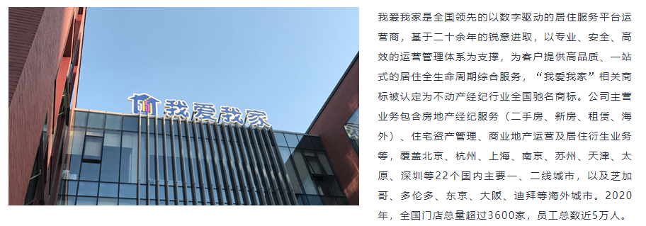 我愛我家是全國領先的以數字驅動的居住服務平臺運營商,基于二十余年的銳意進取,以專業、安全、高效的運營管理體系為支撐,為客戶提供高品質、一站式的居住全生命周期綜合服務,“我愛我家”相關商標被認定為不動產經紀行業全國馳名商標。公司主營業務包含房地產經紀服務(二手房、新房、租賃、海外)、住宅資產管理、商業地產運營及居住衍生業務等,覆蓋北京、杭州、上海、南京、蘇州、天津、太原、深圳等22個國內主要一、二線城市,以及芝加哥、多倫多、東京、大阪、迪拜等海外城市。2020年,全國門店總量超過3600家,員工總數近5萬人。
