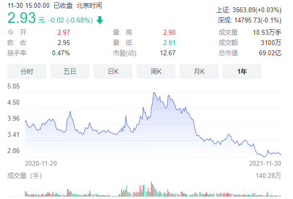 11月30日收盤,我愛我家跌了2分錢,收于2.93元,市值69億元。