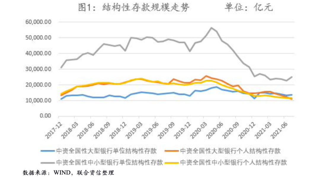 智能存款、結構性存款監(jiān)管趨嚴,靠檔計息存款產(chǎn)品被叫停,存款業(yè)務逐步規(guī)范。商業(yè)銀行存款產(chǎn)品類型除定期存款、活期存款、大額存單、通知存款等傳統(tǒng)存款產(chǎn)品外,還包括結構性存款與銀行智能存款等“創(chuàng)新”存款產(chǎn)品。為增強存款業(yè)務吸引力、豐富金融產(chǎn)品體系,以中小銀行為主的部分商業(yè)銀行開展與利率、匯率、指數(shù)等波動掛鉤的結構性存款業(yè)務,結構性存款規(guī)模處于較高水平;但結構性存款業(yè)務的發(fā)展也帶來了高息攬存、資金面寬松背景下的套利和資金空轉等問題。為此,中國銀行保險監(jiān)督管理委員會(以下簡稱“銀保監(jiān)會”)于2019年10月末發(fā)布《關于進一步規(guī)范商業(yè)銀行結構性存款業(yè)務的通知》,在12個月過渡期內(nèi),商業(yè)銀行可以繼續(xù)發(fā)行原有的結構性存款,但應當嚴格控制在存量產(chǎn)品的整體規(guī)模內(nèi),并有序壓縮遞減;對于過渡期結束前已經(jīng)發(fā)行的結構性存款,商業(yè)銀行應當及時整改,到期或兌付后結清。2020年,中小銀行結構性存款規(guī)模僅有前4個月的余額正向增長,此后結構性存款規(guī)模呈快速下降態(tài)勢(見圖1);相對于大型銀行來說,中小銀行對結構性存款依賴程度更高、規(guī)模壓降幅度更大。截至2021年6月末,中小型銀行結構性存款余額已壓降至34617.89億元,較2020年最高點下降56.22%;大型銀行余額為25785.41億元,較2020年最高點下降39.60%。