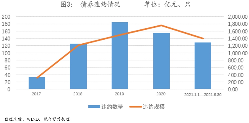 另一方面,現(xiàn)階段我國經(jīng)濟進入新常態(tài),在國家產(chǎn)業(yè)結構持續(xù)調(diào)整優(yōu)化、經(jīng)濟增速放緩的大背景下,資本市場違約事件增多,部分存續(xù)非標投資資產(chǎn)面臨的信用風險持續(xù)上升。根據(jù)wind資訊顯示,2020年共有155只債券發(fā)生違約,違約規(guī)模合計1757.72億元(見圖3),債券違約規(guī)模創(chuàng)造歷史新高;2021年上半年共有129只債券發(fā)生違約,違約規(guī)模合計1392.50億元。由于中小銀行對非標投資底層資產(chǎn)所涉及的產(chǎn)業(yè)、融資方等方面缺乏深入透徹的分析,內(nèi)部缺乏成熟的評級體系以及風險防控技術,對底層融資方情況的了解通常依賴于公開評級報告或新聞輿情。因此,在信用風險事件頻發(fā)的大背景下,中小銀行存續(xù)的非標類資產(chǎn)違約的可能性更大。